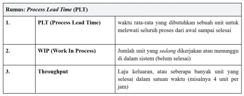 Rumus ini menjelaskan hubungan antara jumlah pekerjaan yang sedang berlangsung (Work In Process/WIP) dan kecepatan sistem dalam menyelesaikan pekerjaan (Throughput) terhadap lamanya waktu penyelesaian rata-rata suatu proses (Lead Time). Jadi, semakin besar jumlah pekerjaan yang menumpuk di dalam sistem, semakin lama juga waktu yang dibutuhkan untuk menyelesaikan satu produk secara keseluruhan. Sebaliknya, semakin tinggi kecepatan sistem dalam menghasilkan output, semakin singkat waktu yang dibutuhkan untuk menuntaskan setiap unit produk.