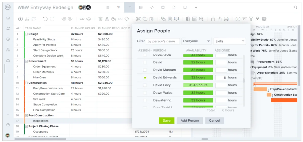 Pada gambar ini terlihat daftar tugas lengkap dengan jumlah jam kerja yang direncanakan (planned hours), biaya, serta Gantt chart di sisi kanan yang memetakan jadwal kegiatan. Selain itu terdapat fitur assign people yang menunjukkan ketersediaan dan jam kerja setiap anggota tim. Elemen-elemen ini adalah ciri utama workload chart: menampilkan siapa yang mengerjakan tugas tertentu, berapa lama waktunya, dan kapan pekerjaan itu dijadwalkan. Chart seperti ini berfungsi untuk mengatur distribusi beban kerja secara visual dalam konteks waktu, sehingga manajer proyek dapat menghindari penumpukan atau kekosongan pekerjaan.