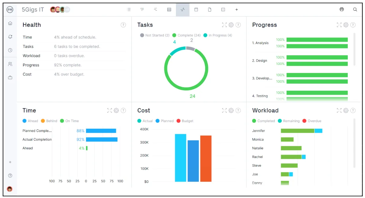 Gambar ini menampilkan berbagai panel yang merangkum kondisi proyek: health, tasks, progress, time, cost, dan workload. Visualisasi menggunakan grafik lingkaran, grafik batang, serta indikator persentase penyelesaian. Inilah ciri khas dashboard, yang menyajikan data dari berbagai sumber (timesheet, workload chart, laporan progress) ke dalam bentuk ringkasan visual yang mudah dipantau secara real time. Fungsinya bukan untuk mencatat atau merinci tugas, melainkan untuk memonitor performa proyek secara keseluruhan dan memastikan beban kerja tim tetap seimbang.